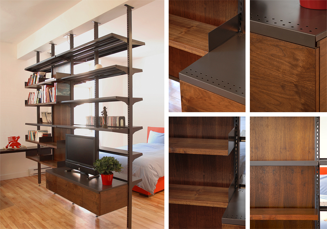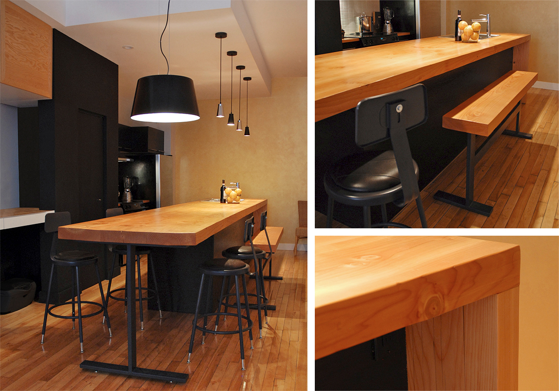 Le Projet Clark transforme un petit logement montréalais en optimisant l’espace grâce à une réutilisation créative et un design sur mesure. L’objectif était de maximiser l’espace tout en insufflant une nouvelle vie à des éléments et du mobilier existants. Un long comptoir en Sapin de Douglas, apportant chaleur et authenticité, s’intègre harmonieusement à la cuisine existante, préservant ainsi le caractère du lieu tout en optimisant l’utilisation des matériaux existants. Le point central du projet est la conversion de mobilier commercial en une paroi de rangement polyvalente, à la fois bibliothèque et séparateur d’espace. Cette structure en bois et métal confère une esthétique contemporaine, tout en respectant l’esprit industriel de l’immeuble.
